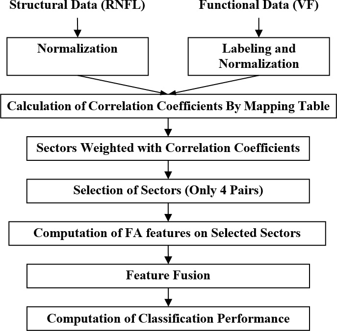 This work proposes novel selective feature fusion of structural and functional data for improved glaucoma detection. The structural data such as retinal nerve fiber layer (RNFL) thickness measurement acquired by scanning laser polarimetry (SLP) is fused with the functional visual field (VF) measurement recorded from the standard automated perimetry (SAP) test. The proposed selective feature fusion exploits correspondence between structural and functional data obtained over multiple sectors. The correlation coefficients for corresponding structural-function sector pairs are used as weights in subsequent feature selection. The sectors are ranked according to the correlation coefficients and the first four highly ranked sectors are retained. Following our prior work, fractal analysis (FA) features for both structural and functional data are obtained and fused for each selected sectors respectively. These fused FA features are then used for glaucoma detection. The novelty of this work stems from (i) locating structure-functional sectoral correspondence; (ii) selecting only a few interesting sector pairs using correlation coefficient between structure-function data; (iii) obtaining novel FA features from these pairs; and (iv) fusing these features for glaucoma detection. Such a method is distinctively different from other existing methods that exploit structure-function models in that structure-function sectoral correspondences have been weighted and, based on such weights, only portions of the sectors are retained for subsequent fusion and classification of structural and functional features. For statistical analysis of the glaucoma detection results, sensitivity, specificity and area under receiver operating characteristic curve (AUROC) are calculated. Performance comparison is obtained with those of existing feature-based techniques such as wavelet-Fourier analysis (WFA) and fast-Fourier analysis (FFA). Comparisons of AUROC values show that our novel selective feature fusion method for discrimination of glaucomatous and ocular normal patients slightly outperforms other existing techniques with AUROCs of 0.98, 0.98 and 0.99 for WFA, FFA and FA respectively.References