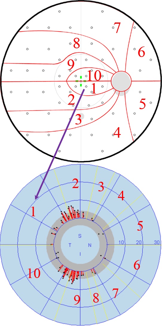 Ferreras, A., Pablo, L. E., Garway-Heath, D. F., Fogagnolo, P., and Garcıa-Feijoo, J., “Mapping Standard Automated Perimetry to the Peripapillary Retinal Nerve Fiber Layer in Glaucoma,” Invest. Ophthalmol. Vis. Sci., Vol. 49 (7), pp. 3018-3025, Jul., (2008).