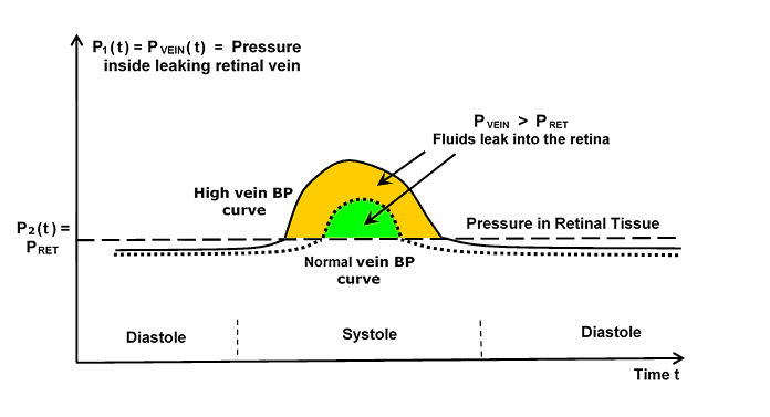 Methods: A mathematical model of ADR is derived; it is based on fluid leakage from abnormal ‘holes’ in small retinal blood vessels. First, the volume of a microscopic fluid droplet leaking from a single small vein-hole during a single heartbeat is derived from the Navier-Stokes flow-equations. Then, total fluid volume leaking into the retina from all M vein holes in N heartbeats is determined. Six parameters in the equations of the model with significant influence on leakage rates and leaked volumes are identified. These insights are used to design and then apply five simple, novel, and eff icient therapeutic treatments, T1 to T5, that may achieve recovery from ADR without laser surgery or Avastin injections. Daily rates, as well as total volumes, of macular fluid accumulation, removal (by eye-pumps), and leakage are calculated from optical coherence tomography (OCT)-measured macular thicknesses.